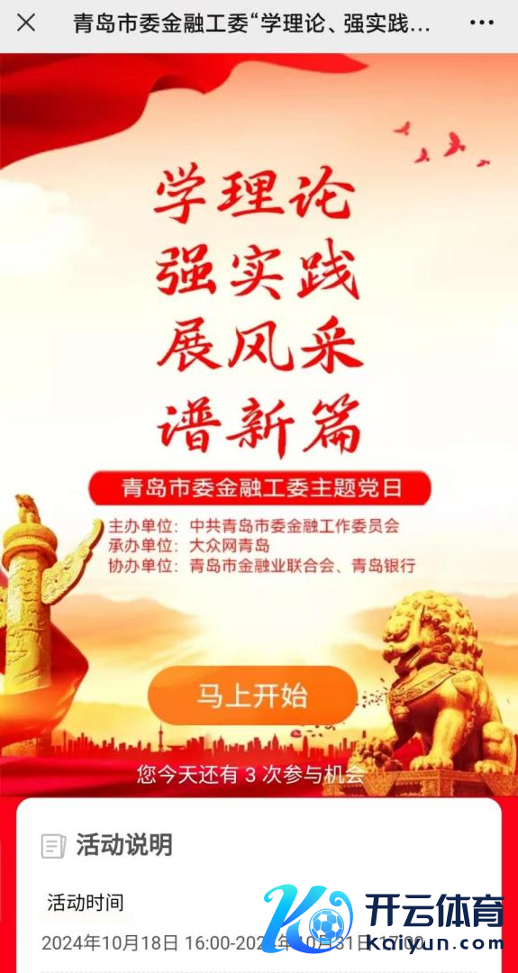 近日,中共青岛市委金融责任委员会全心策动组织的青岛金融专题宣传月看成开展得未艾方兴,尤其是青岛市委金融工委“学表面、强引申、展仪态、谱新篇”主题党日学问问答小模范引诱了逾2万东谈主次在线参与,在金融鸿沟及社会各界引起了平淡关注和热烈反响。