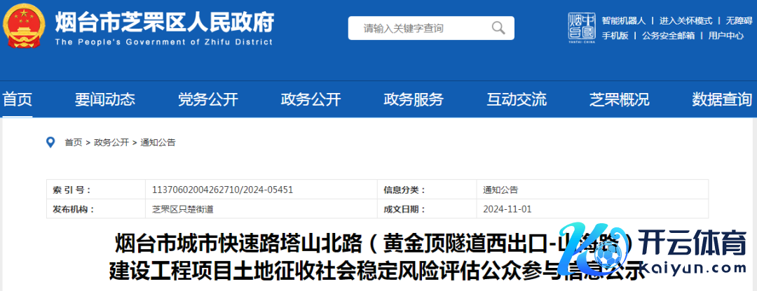 日前,芝罘区东说念主民政府网站公布了烟台市城市快速路塔山北路(黄金顶约略西出口-山海路)诞生工程姿首地盘征收社会踏实风险评估公众参与信息公示。