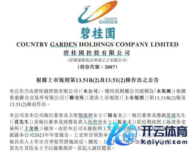 【大河财立方音问】12月7日音问开云官网切尔西赞助商,碧桂园昨日晚间发布公告称,因未能定期清楚公司2023年年度讲演,公司及杨惠妍、莫斌等被上交所赐与通报月旦。