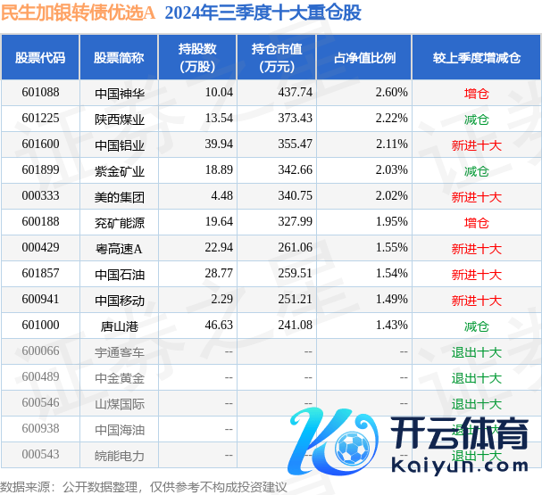 民生加银转债优选A为债券型-夹杂二级基金,字据最新一期基金季报透露,该基金钞票竖立:股票占净值比19.95%,债券占净值比111.02%,现款占净值比2.1%。基金十大重仓股如下: