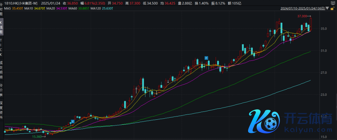 1月24日,小米股价盘中一度大涨超8%,再创历史新高。收盘股价有所回落,报36.85港元/股,涨幅6.81%,亦为历史收盘新高。总市值9251亿港元。