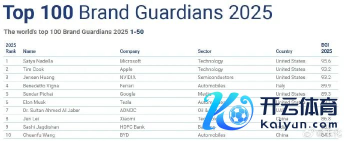 榜单知道,位列第一的是微软公司CEO纳德拉,苹果公司CEO库克紧跟后来,排名第二,英伟达CEO黄仁勋位居第三,位居第四位的是法拉利CEO贝内代托·维格纳,而谷歌CEO皮查伊排名第五,排名第六位的是特斯拉CEO埃隆·马斯克,第七为动力巨头ADNOC公司CEO Dr.Sultan Ahmed Al Jaber,排名第九位的是印度私营银行HDFC Bank的CEO Sashi Jagdishan。