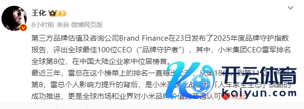 与此同期,当天一则对于小米CEO雷军的音问,也激发怜惜。近日,第三方品牌估值及研究公司Brand Finance发布的名次榜知道,雷军位列宇宙最好CEO第八。