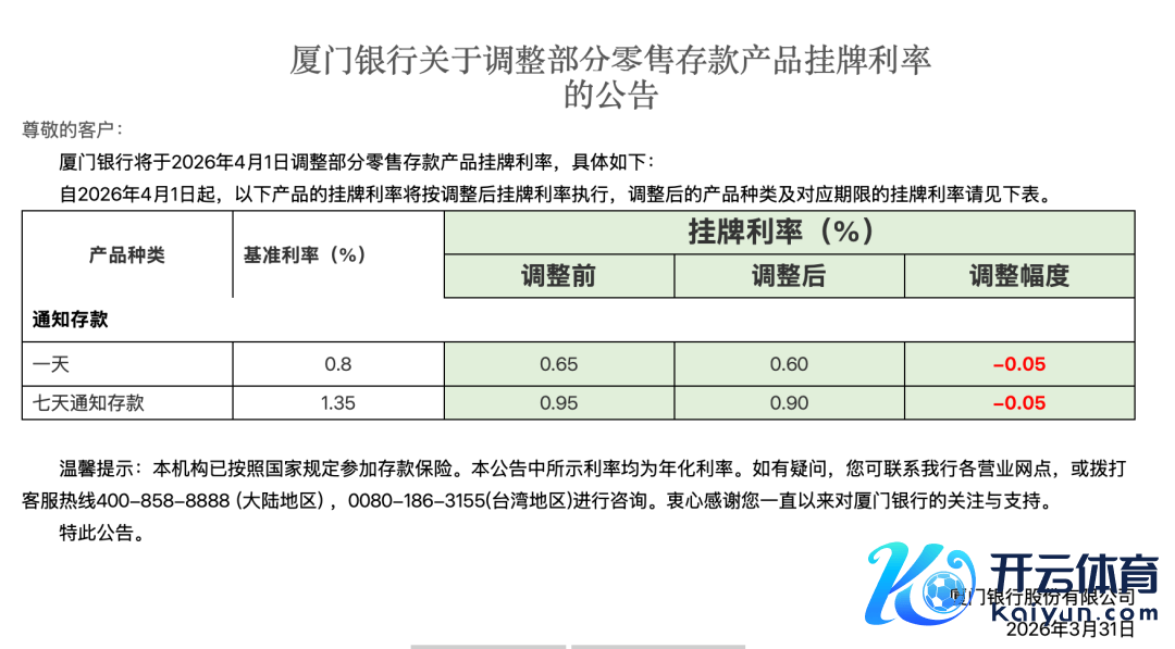 3月31日,厦门银行再次对一天、七天奉告进款利率进行下调。凭据最新公告,自4月1日起,一天奉告进款利率从0.65%降至0.6%,七天期奉告进款利率从0.95%降至0.9%,均下调5BP。