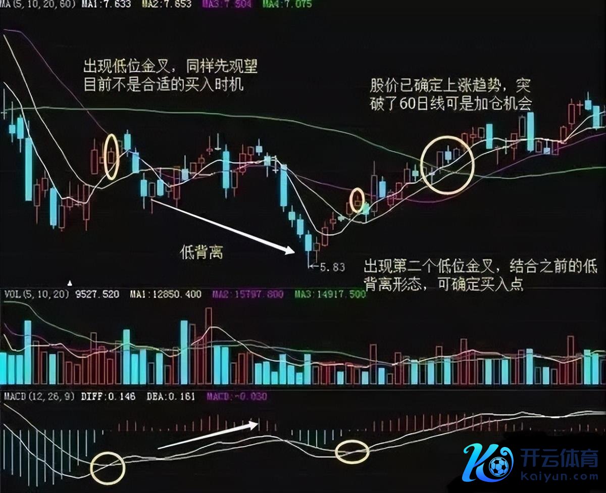 MACD在低位运转的时候与股价酿成了底背离的走势;当股价上穿60日线的时候,上升趋势详情,加仓的契机;0轴下方出现第二个金叉的时候为精确买入点。