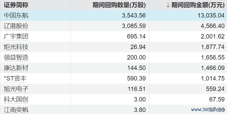 10家上市公司股票获回购,中国东航回购金额最高10家上市公司股票获回购,中国东航回购金额最高