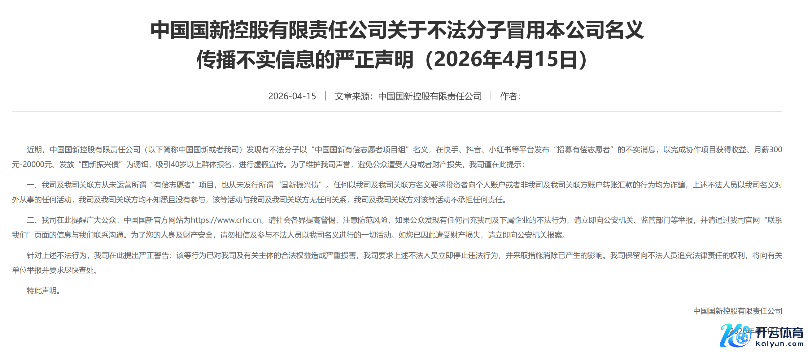 近日开云体育,中国国新控股有限包袱公司发布《对于违警分子冒用本公司形状传播装假信息的严正声明》: