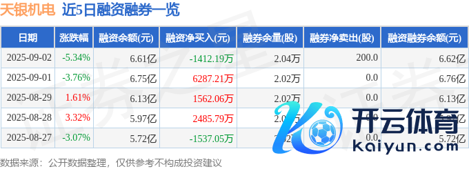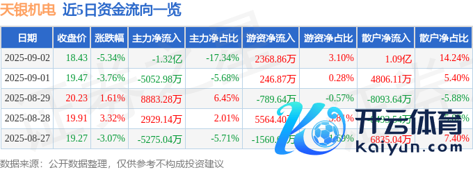 本站音书,扫尾2025年9月2日收盘,天银机电(300342)报收于18.43元,着落5.34%开云体育,换手率9.84%,成交量41.2万手,成交额7.63亿元。