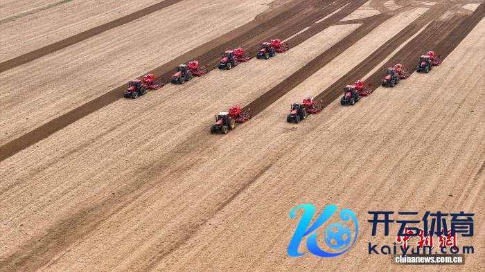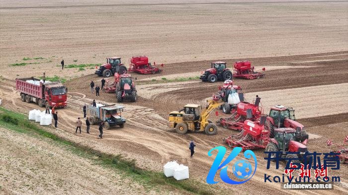 10月30日,在安徽省蚌埠市五河县朱顶镇,蚌埠市云好意思农业有限公司的工东谈主们正驾驶农机在田间播撒冬小麦。(无东谈主机相片) 中新社发 李上前 摄