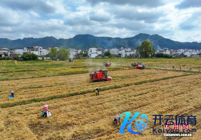 10月15日,秋雨初歇,在安徽省黄山市黟县碧阳镇横岗村,农民抢捏时机收割水稻。(无东谈主机相片) 中新社发 施亚磊 摄