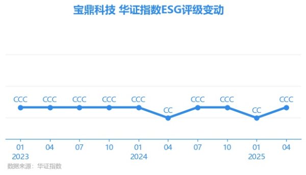 日前,华证指数公布了新一期(2025年4月30日)的ESG评级后果,宝鼎科技(002552.SZ)获取CCC评级(华证指数评级为C起至AAA九档,C为最低档,AAA为其最高一级评级/AA为其第二档),上一期(2025年1月31日)ESG评级为CC。本期ESG评级在490家机械制造行业A股上市公司中名轮番406(上一期名轮番375)。 从细项得分来看,宝鼎科技E项得分57.01,评级为C,行业内名次......【更多...】