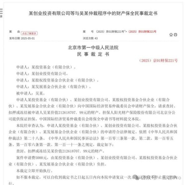 ZAKER 财经 6 月 24 日音讯,近日,北京市第一中级东谈主民法院裁定,梅花创投吴世春所掌控的超 2 亿元的财富遭到查封、扣押或冻结。 裁定书暴露,请求东谈主某投资基金(有限合股)、某创业投资有限公司、某股权投资基金合股企业(有限合股)、某发展基金合股企业(有限合股)向中国外洋经济买卖仲裁委员会请求财产保全,请求查封、扣押或冻结被请求东谈主吴某价值 212618707.99 元的财产。 法院......【更多...】